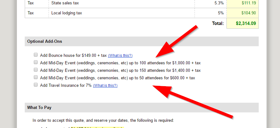 Imagine that you've sent a quote to a guest (or they came through your Book Now widget on your website). You want them to be able to "add on" some optional thing - pool heat, linen service, flowers, whatever. Now you can. Here's a live quote I just created: