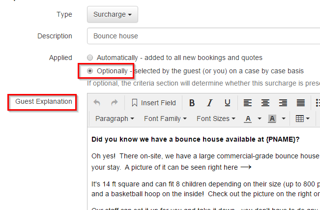 So head over to Settings > Surcharges and create a new Surcharge. Set the Applied field to Optional. You'll notice an Explanation field appear with a rich-text editor. The Explanation field is optional. If you don't enter anything, the "What is this?" link won't be shown to guests.