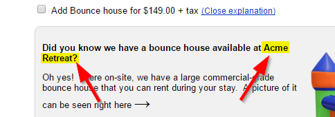 Notice the property name "Acme Retreat" in this explanation. That's coming from a field code which changes the output based on which quote the guest is looking at.