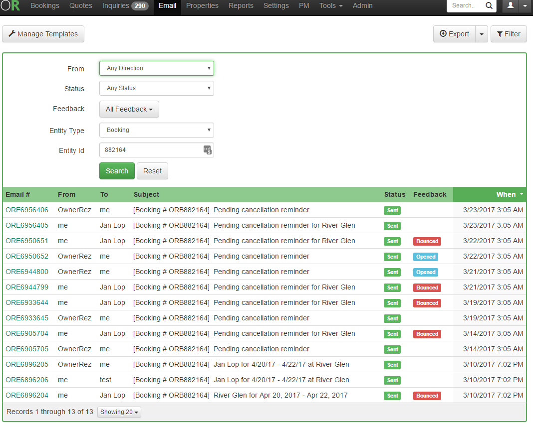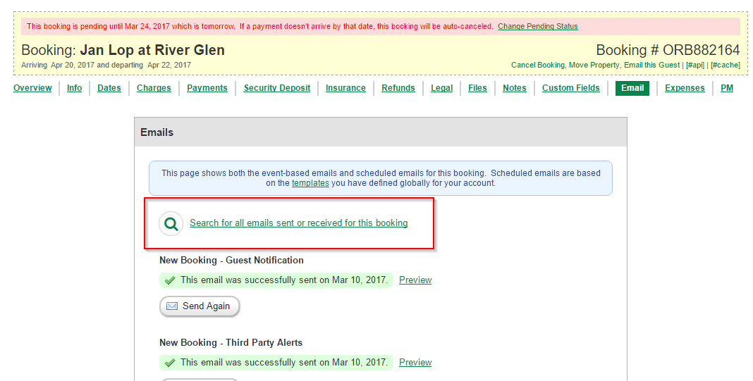 To fix that, we've added a new search in each booking on the email tab that will search for all emails sent and received for that booking -- including quote, inquiry, payment etc. emails. If you click the link: