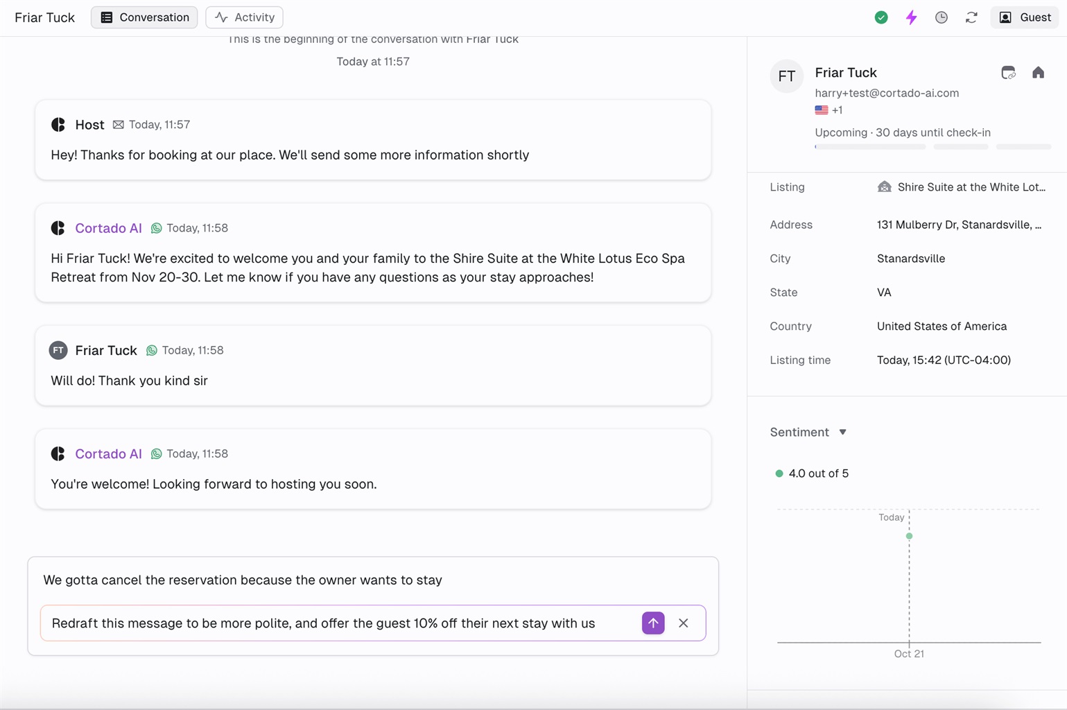 - Onboarding takes minutes: Cortado’s AI Agents start working out of the gate, with minimal onboarding and no initial “training” required to answer guest messages.