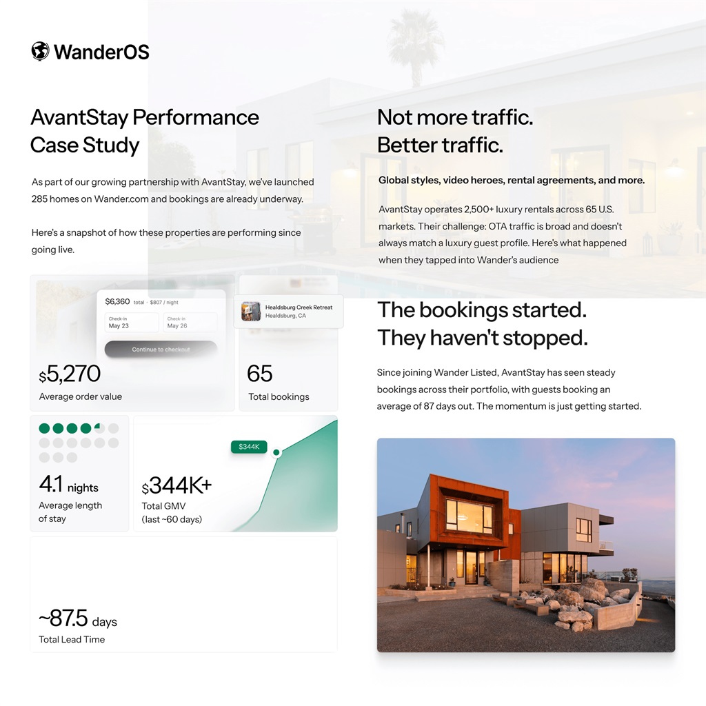 Wander.com is a luxury OTA channel focused on the top 10% of short-term rental inventory, where nightly rates consistently outperform Airbnb and Vrbo. Think higher occupancy, better guests, and a brand that commands trust from day one. Wander drives massive demand, with over 750,000 high-intent users in the network and six figures in monthly ad spend fueling growth. That includes differentiated distribution channels most operators can’t access, like influencer partnerships and Comcast TV, where Wander achieves ~100,000 placements daily.
