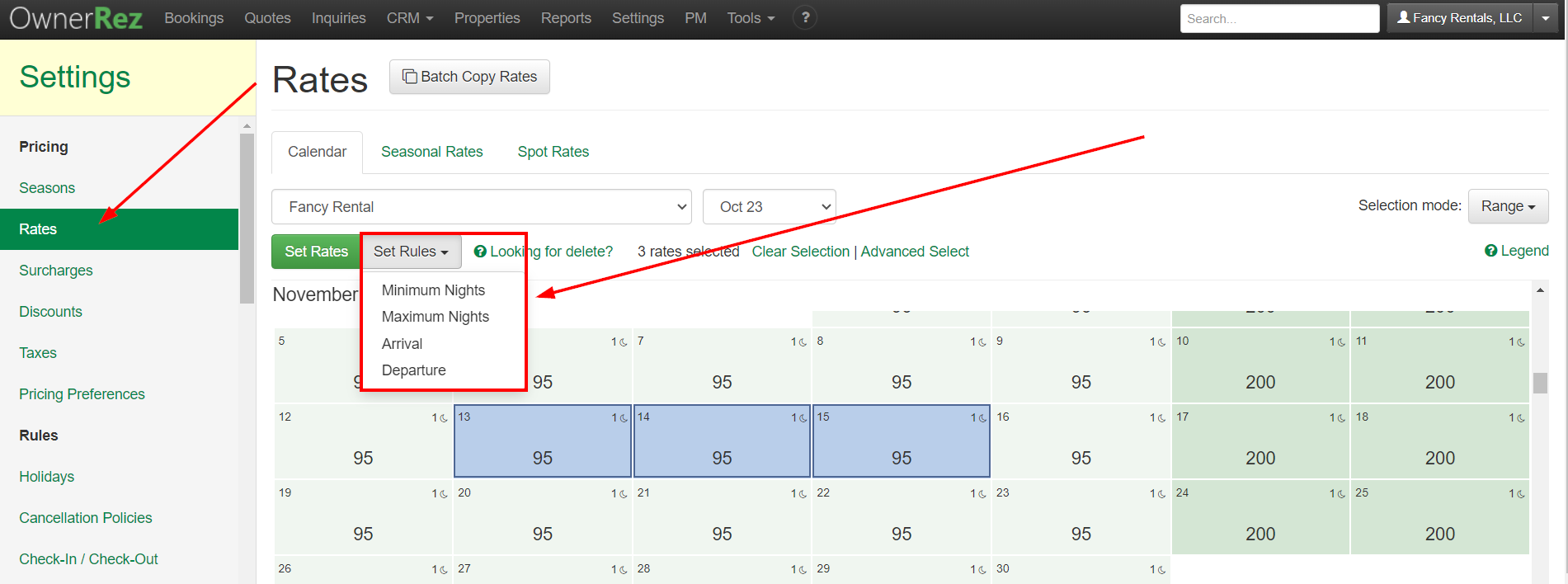 Here's the old Set Rules dropdown menu, with individual selections for Arrival and Departure. This was good, but users could easily miss adding either an Arrival or Departure rule as they were separate steps.By selecting Changeover from the Set Rules dropdown menu, users can now determine Arrival, Departure, or Gap rules in one process. Notice that we selected Thanksgiving Day 2023.