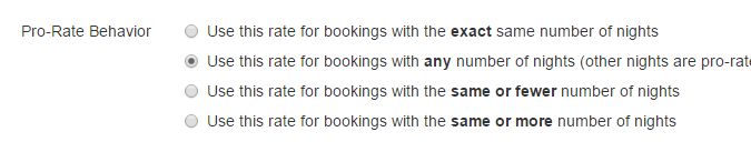 You can now specify exactly how each of your rates pro-rates in relation to the total number of nights in a booking. Before, pro-ration would simply be in every direction and it would only be used if the number of nights fit neatly inside the current season. You can now be more choosy about how pro-ration works.