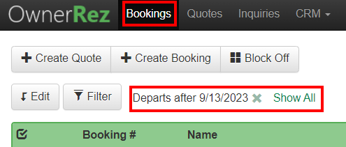 Now, the only default filter added to the Bookings List view is the "Departs after today's date" and the Show All link. All canceled and pending bookings are now displayed by default. Of course, users can always change or clear their "stickier" filters by clicking on the Show All link.