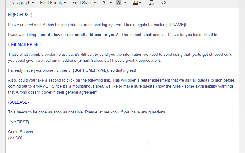 You'll want to tailor that to your own liking, but it works well. The BGEMAILPRIME field fills in the Airbnb proxy email address that our system scooped out of the iCal field.