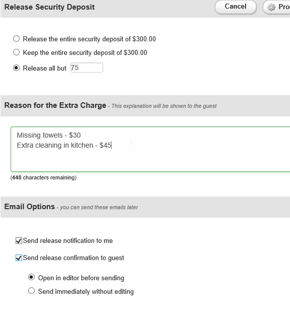 After departure, our system emails you (once per day, every day) until you release the security deposit hold. It's a very fast process that typically is just one click. There is also email templates that can be sent at that point, telling the guest their security deposit was released.