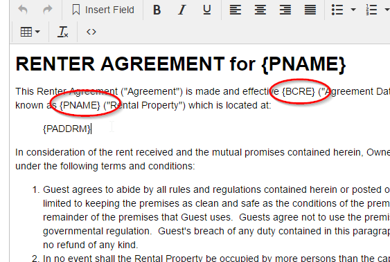 For instance, here's what our renter agreement looks like in the editor: I circled a couple of field codes so that you can see what I mean. We have a lot of field codes for all the common booking-related type of information you may want your renter agreement to include. Some of the field codes (it's a big list):