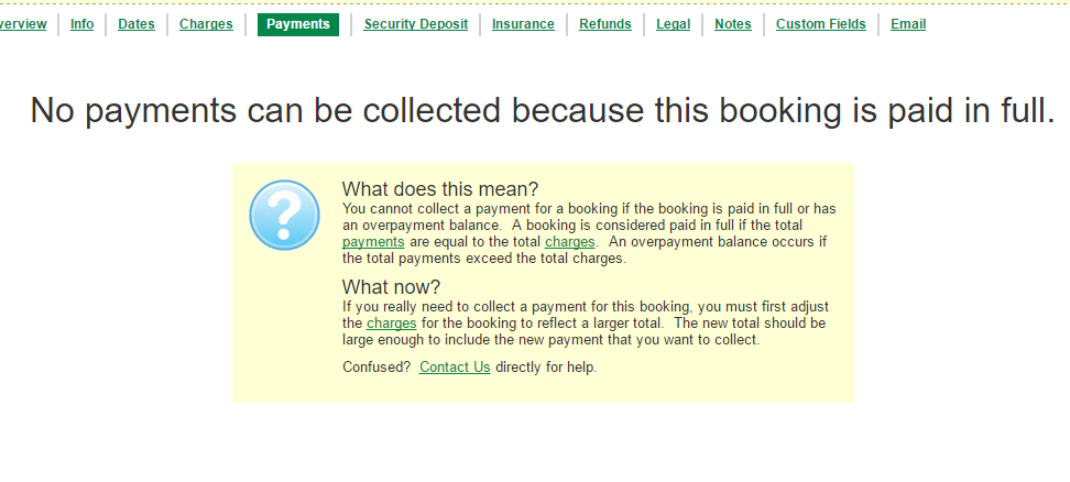 I was afraid to use 'collect additional payment' as I thought that would cause to collect money ==in addition== to her outstanding amount due. I thought collect additional payment was meant for price changes such as extra money for extra people or pets added later, or some rebooking/change fee. etc added after the fact.