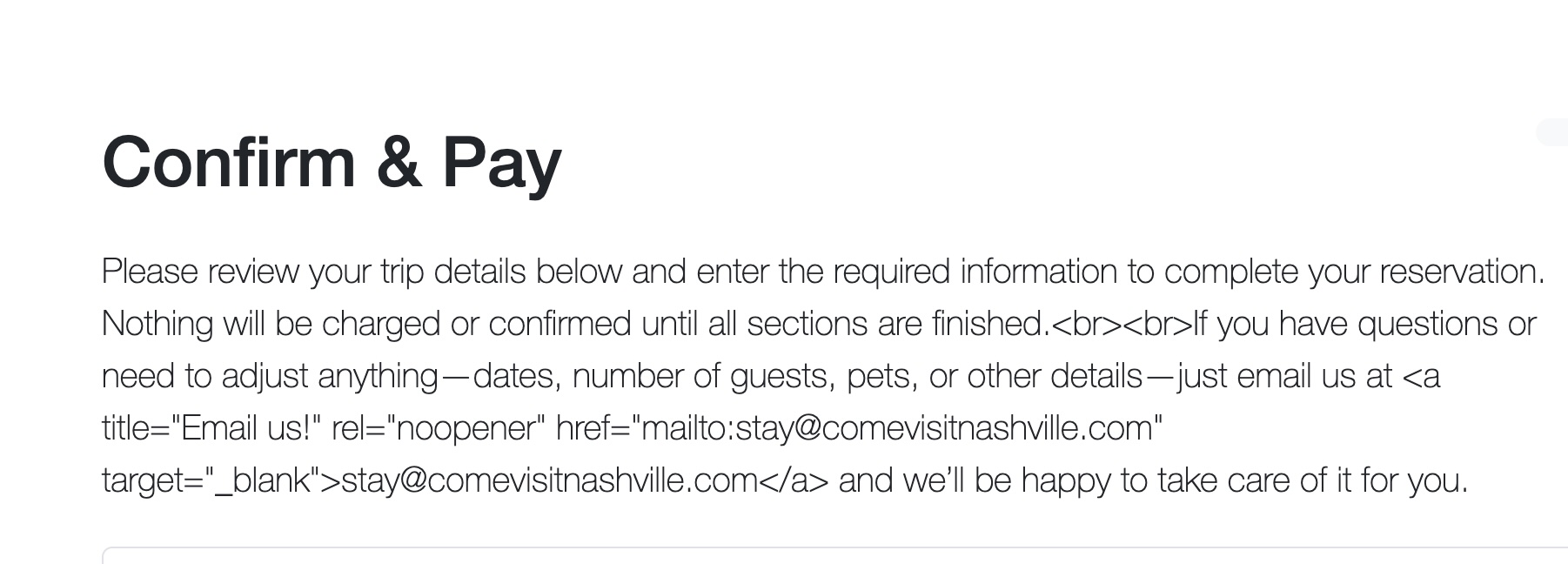As the guest is unable to make changes on this screen (should the dates, number of guests/pets, etc. be incorrect), they will have to be directed to email us to make those changes on their behalf. (Bummer #1.) Being able to add our email address into that text box as a clickable link is needed to make this process as streamlined and easy as possible for our guests. Is there plans to make this destination text box accept the formatting added in the Edit screen??