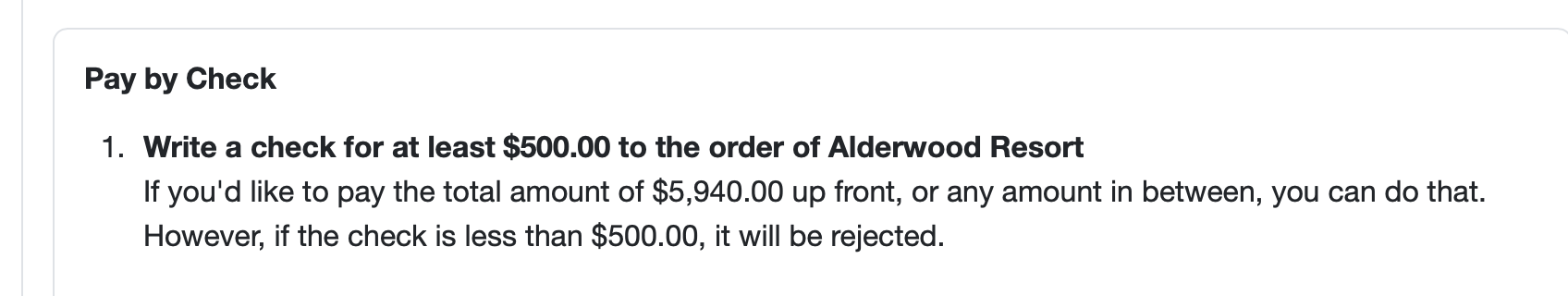 Additionally, when checking out on this new Confirm & Pay form this is the message for paying with check. It is not correct for my vacation rental policies, where do I update it?