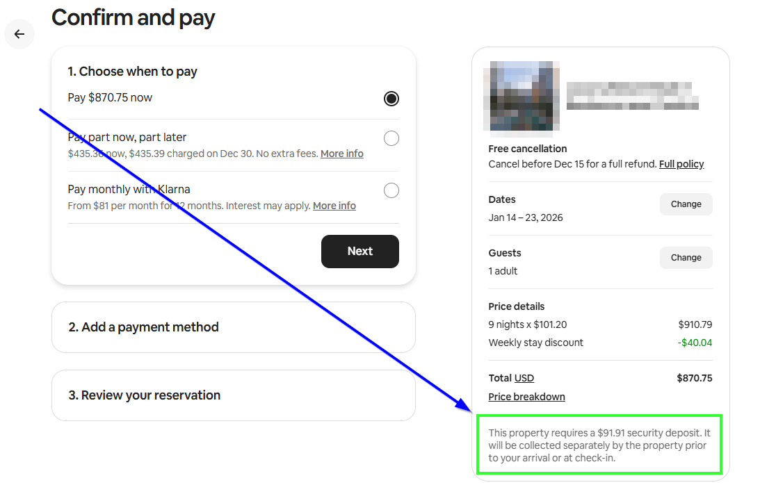 However, as a Software-connected Host, Airbnb allows for external security deposit holds in certain cases. In my case, this is fully aligned with Airbnb’s policies. The deposit is clearly stated in my House Rules—visible before booking—and Airbnb also flags this during the booking process below the Price Details section of the "Confirm and pay" screen.