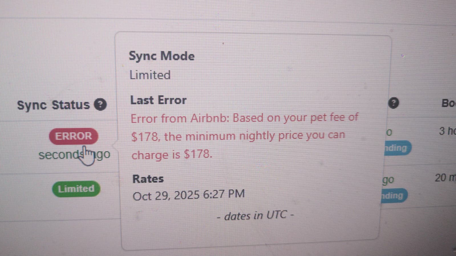 Has anyone else gotten this error? I adjusted the additional percentage in the channel integration for Airbnb, but there is a sync error about the pet fee. On the Airbnb side, the Pet fee is lower than what this says, so I'm really confused. I try to adjust the pet fee up and down, but it seems to have no effect on this error.