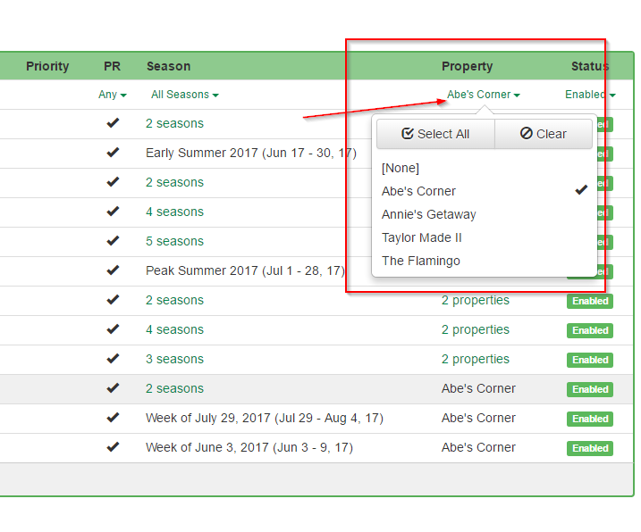 In the meantime, you can go to the rates section and filter it by property to see everything that applies to a property. For example: ... click the "All Seasons v" value under Property and check one or more properties to filter the list just to that property.