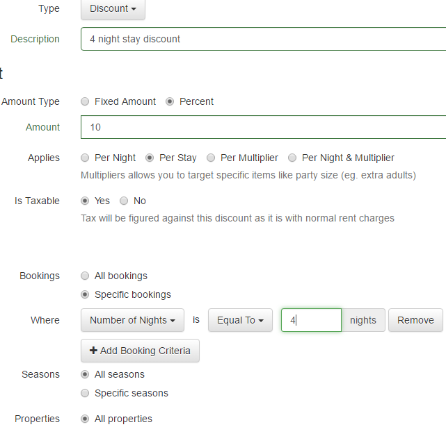 Then add another for 5 nights or 6 nights or whatever you want. You could also make a range of them so that the same discount applies to greater than 4 nights but less than 7. Play with the criteria a bit until you get what you want.