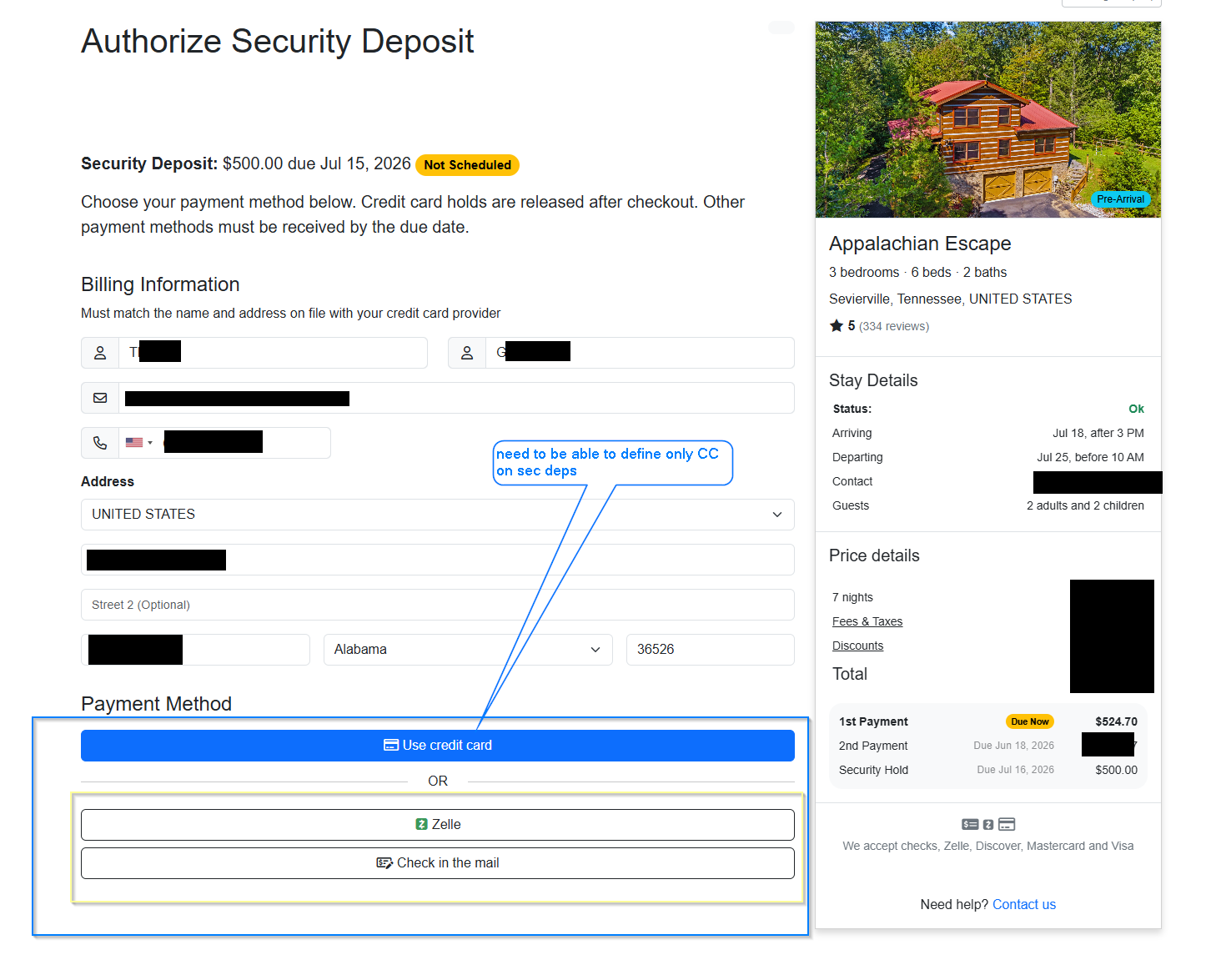 I offer a small optional discount if the guest pays by check or Zelle. Security deposit is cc hold. Sometimes guests pay 1st payment by Zelle, then try to pay 2nd one by credit card (which they should not because they chose the optional discount, but they try). To prevent that, I can set a booking rule to only accept "custom payments" after the 1st payment. However, it also makes sec dep to be by custom payment (Zelle), which I do not want. Conversely, if I have "all available payment methods" on the booking rule, it will show all payment methods on the sec dep for the booking that was paid by Zelle or check - would rather not confuse the guest and have sec dep hold by cc only .
