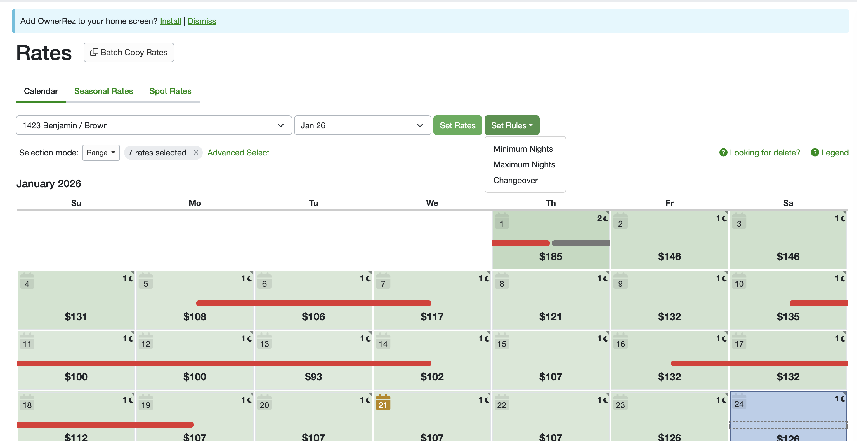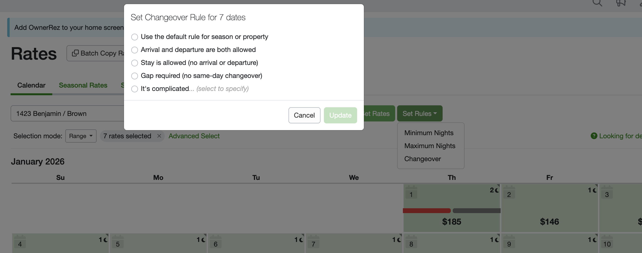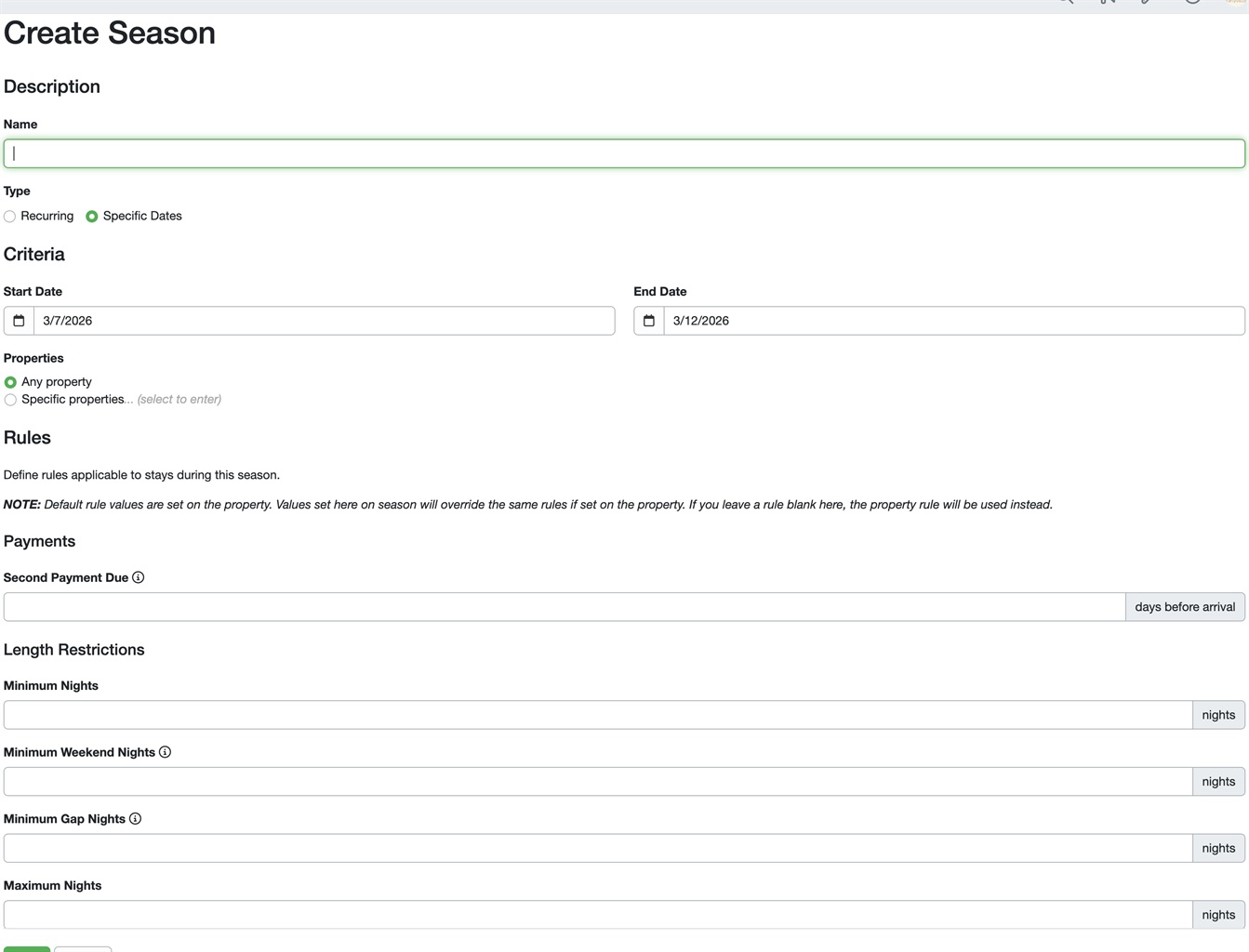 The minimum/maximum night settings from the Rate Calendar are already available within Season settings; it's just the Changeover Rules that are left out for some reason. PLEASE add the Changeover Rules options to the Season settings as well, to help consolidate the number of touchpoints we need to remember to make to change settings as needed.