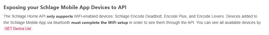 Again, their documentation states, "The Schlage Home API only supports WiFi-enabled devices" and then goes on to list only their Encode models. The request is for them to add their newest WiFi-enabled device, Arrive, to the API.