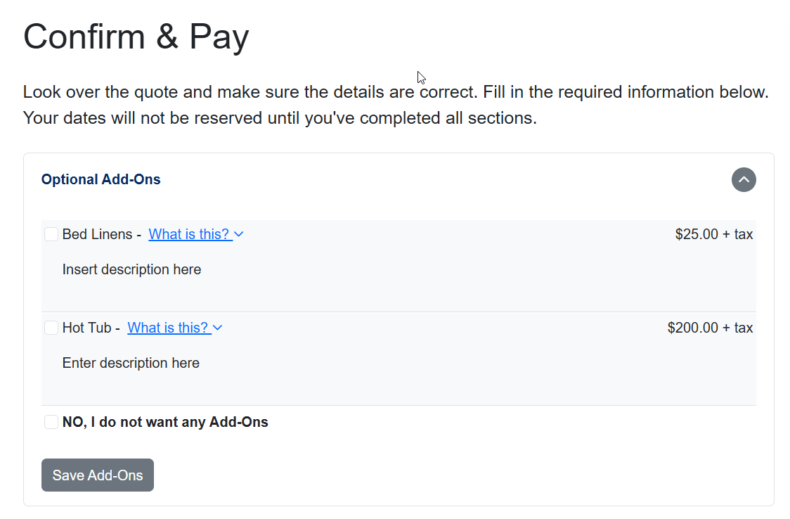 We offer something similar on our confirm and pay form. You'll first want to add those optional surcharges to the account, making sure to give them a description and explanation to the guest of what they're for. More on how to set those up here: https://www.ownerrez.com/support/articles/optional-surcharge