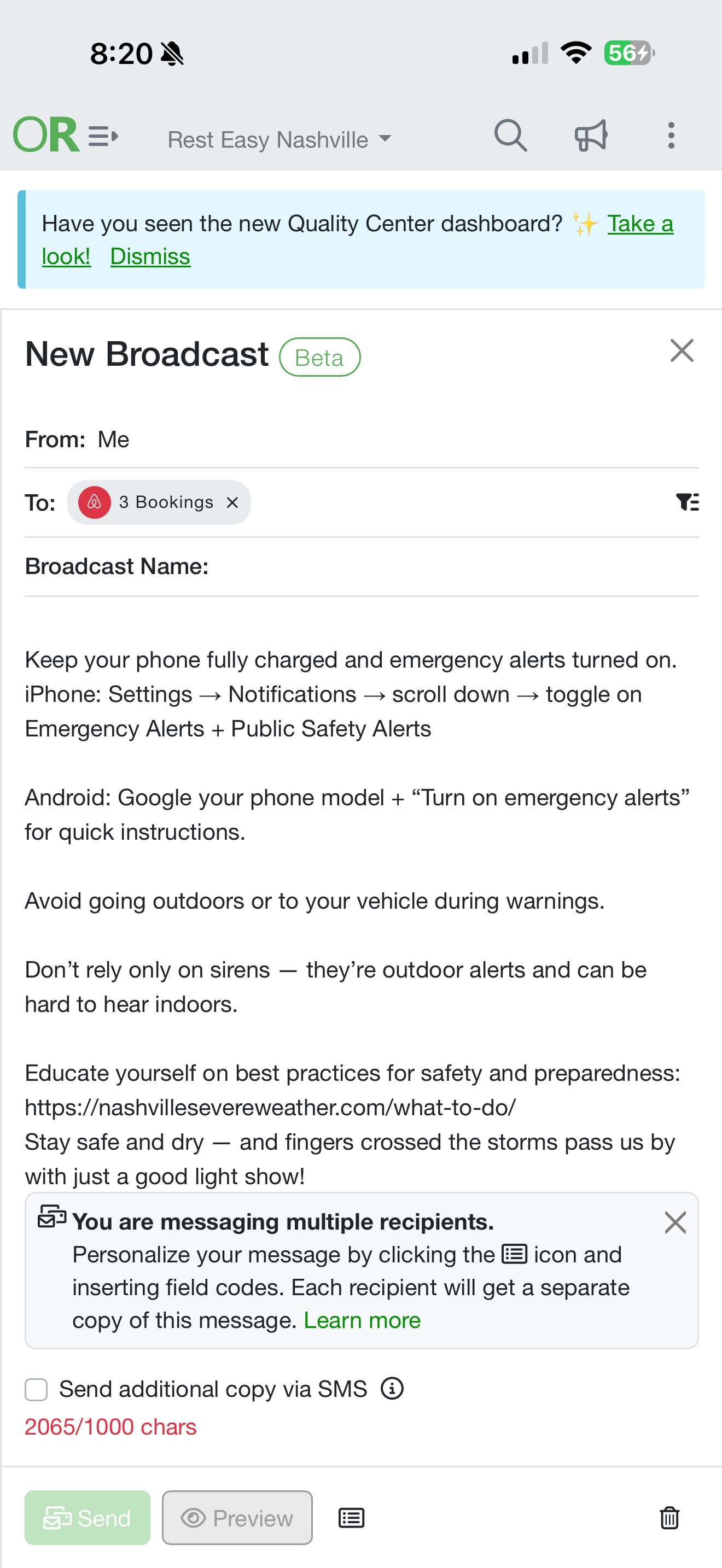 The issue is that Airbnb and Vrbo messages themselves do not have a 1000-character limit, so this restriction prevents us from sending the same templated messages we normally use with guests. The majority of our templated messages exceed 1000 characters and send without any problems. (In this case, I went back to my manual method of sending the templated email and channel message to each current guest and all messages sent just fine.)
