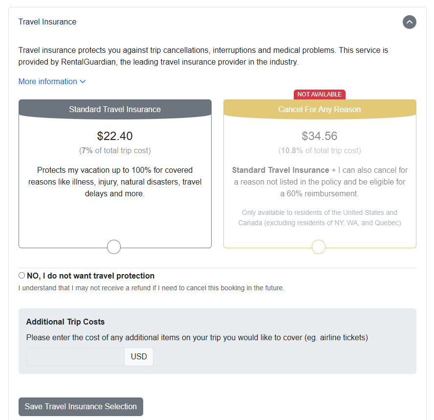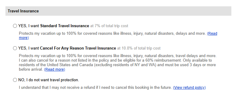 Guests now see "No, I do not want travel protection" with a brief disclaimer about potentially not receiving a refund.