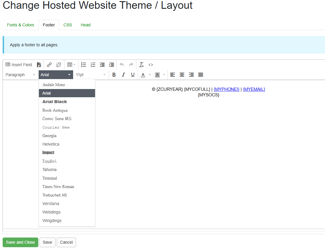 The same goes for making changes to the footer in the theme/layout section, unless I were to add an image vs adding text or inserting a field.