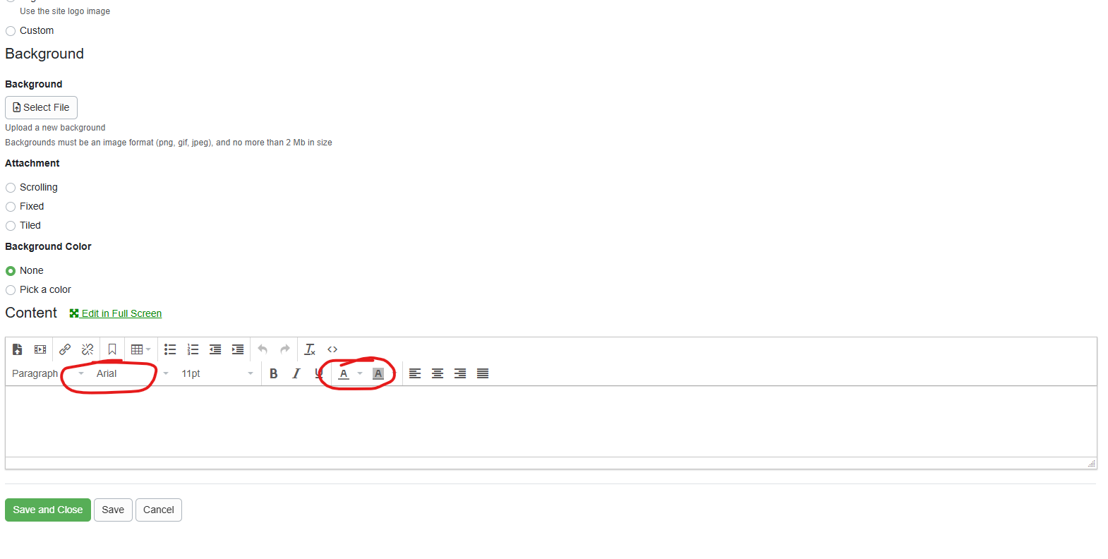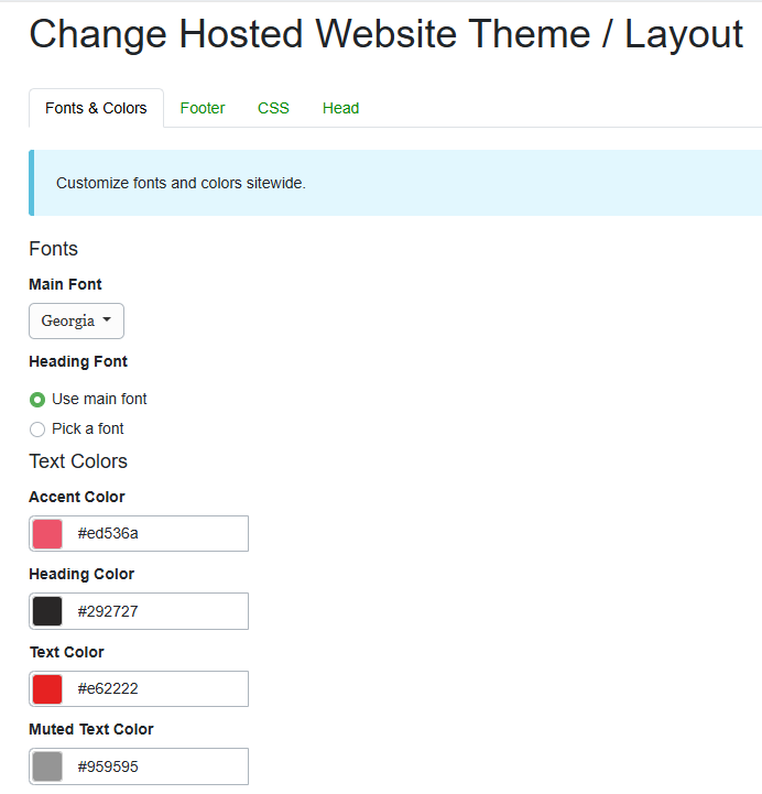 This is also true throughout the pages section. All editable content on the hosted sites should allow for custom changes to the fonts and colors as shown in the theme & layout section without the need to change HTML/CSS. Currently, you need to change code in order to make those changes.