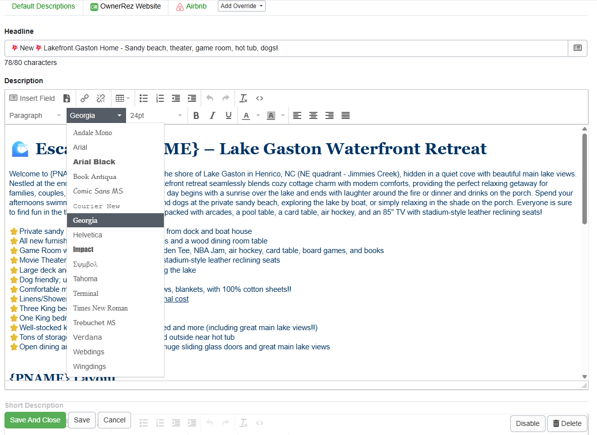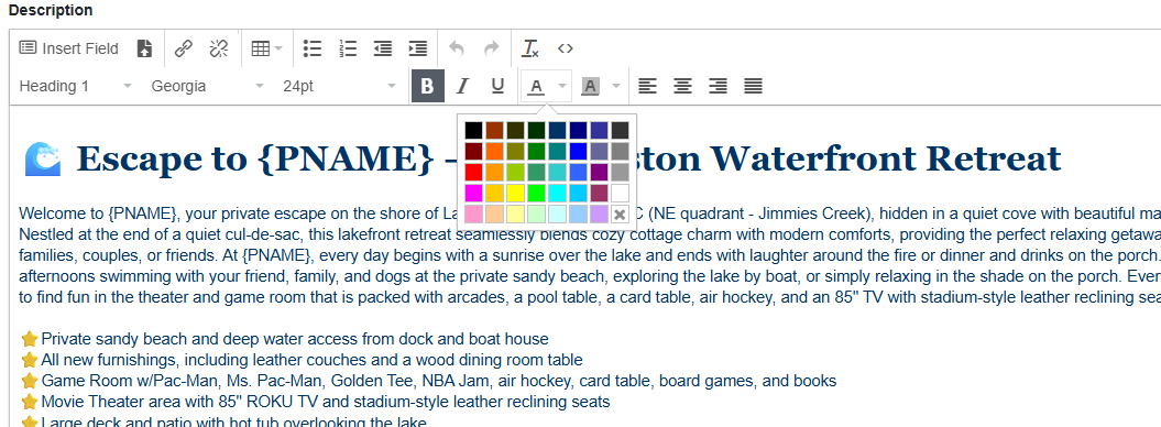 When you manually select colors or fonts in the property description editor, it creates inline styles that take precedence over your hosted website theme settings. This is why your theme colors aren't showing up in your descriptions even though they're applied elsewhere on your site.