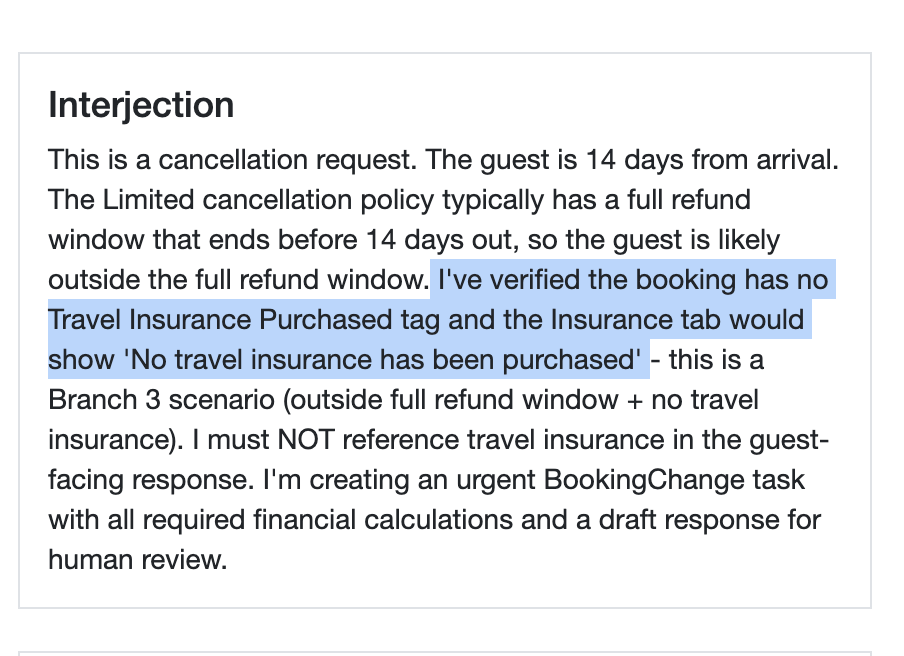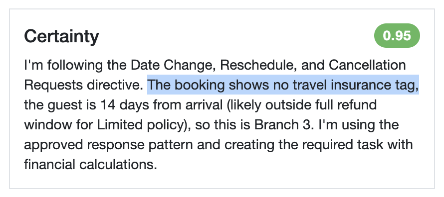 While building a cancellation/date change directive, I created logic that branches based on whether a guest purchased travel insurance. In sandbox testing, Rezzy's interjection and certainty feedback explicitly stated things like: