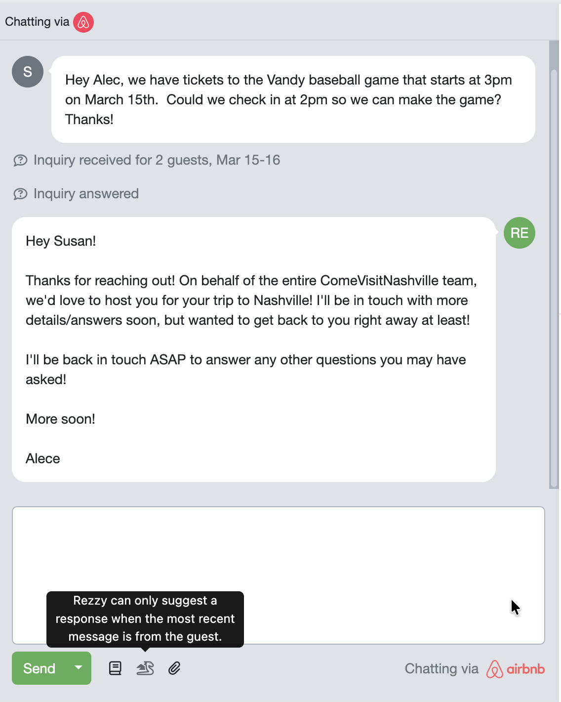 When a guest sends an inquiry or even instant books, our automated message trigger fires off our standard response (as intended/expected). However, then Rezzy cannot suggest a draft reply to the guest's initial message since theirs is no longer the most recent in the thread. This should be corrected so that Rezzy automatically looks for the last message by the guest in order to draft a reply, regardless of whether or not our triggered templates fired off a reply in between.
