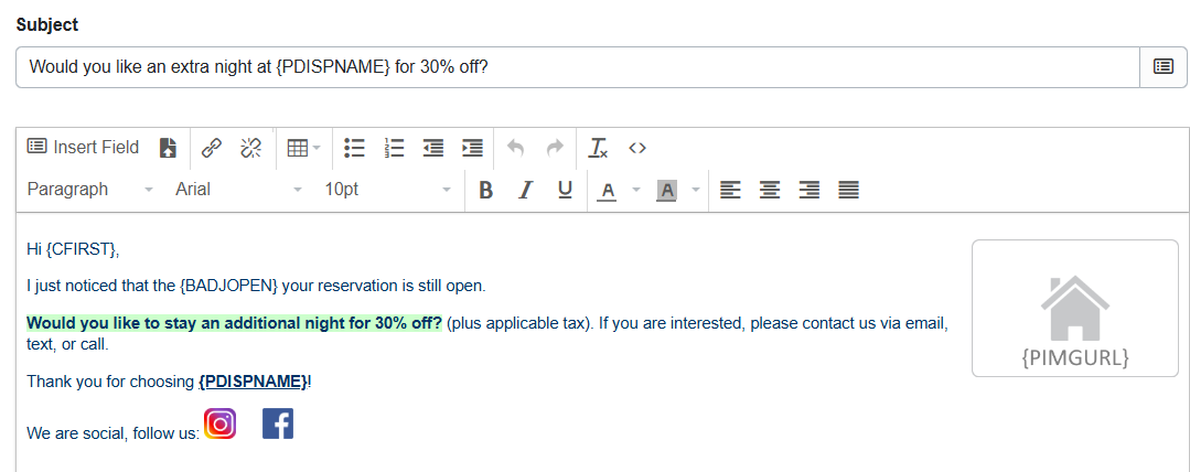 In the meantime, you can do upsells without Rezzy. You can define a template and a trigger to run X days before arrival if you have nights before/after open. Here is an example of a template (my trigger runs 5 days prior). I also have a similar SMS trigger/template.