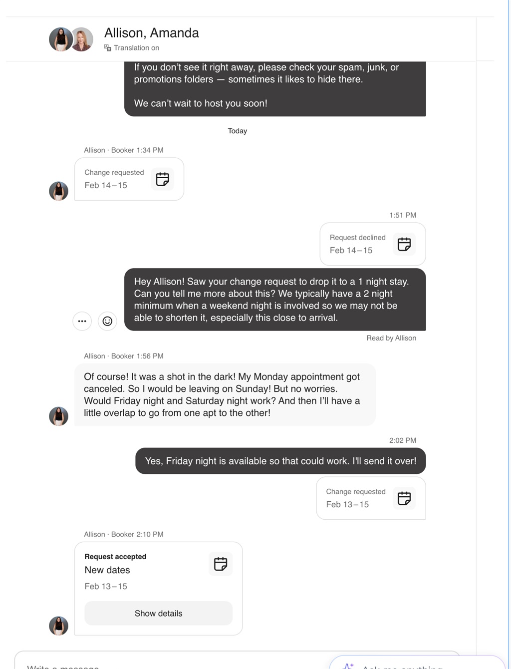 If this is currently blocked by Airbnb’s API limitations, it would be helpful to confirm that — especially since these requests now appear in Airbnb message threads. If it is technically possible via Airbnb's API, I'd love to see these alteration requests in the OR inbox thread with an actionable button to review/approve/decline. This would allow Rezzy to trigger a Task for human involvement as well.