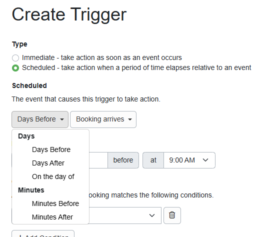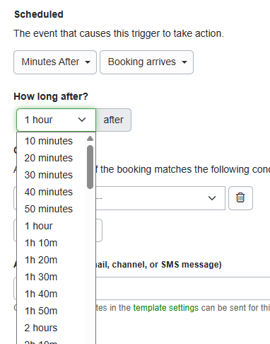 Today's release included the ability to create triggers that run a specific number of minutes before or after booking events, rather than just days. This allows more precise timing for pre-arrival communications and other time-sensitive messages, with options from 10 minutes up to 24 hours.