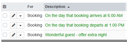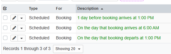 Alternatively, you can filter (by property) and sort your Triggers grid to see what is scheduled to fire when at that property (just click the Description column header to sort it. It'll list event based Triggers first and then scheduled ones), but if you're using the description field in any of your Triggers, that will throw the grid sort off. The grid uses the timing of the Trigger firing in the Description column by default, and any descriptions applied manually will throw them out of order. Here's an example. These are in order from first to last: