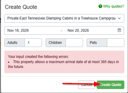 In this case, you can create quotes for dates past your normal availability window. You'll just have to click on create a quote when you see the warning: