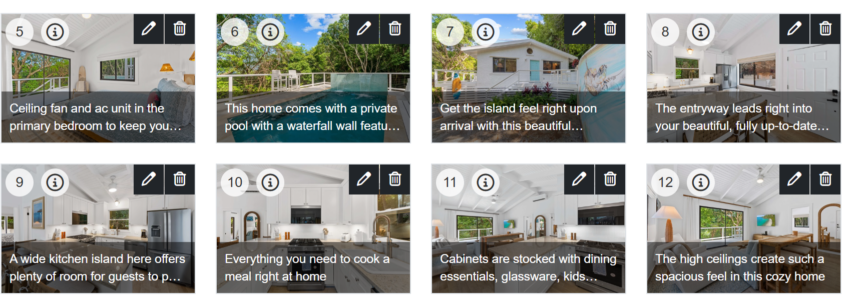 In that spirit, I wanted to give some constructive feedback about a recent update. I noticed the photos section was updated in OwnerRez recently. However, when there are captions on the photos, with the current set up, it makes it very hard to see the photos. I'm rearranging my top 5 photos and I can't see which ones would be better to feature because the caption takes up half the photos.