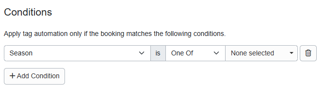 Then, the Tag Automation will automatically apply a tag to a booking that comes in with a date of stay within a particular season. You'd then set up a Trigger to fire to only stays within that Season by adding a condition for the Tag you created.