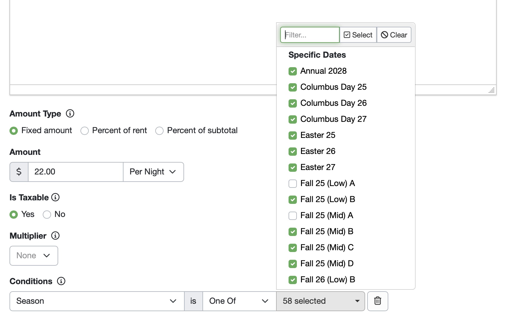 You can restrict which pricing seasons an optional extra is available for. Just select the appropriate pricing seasons that correspond with the season when you want the option available, and voila! The option only shows up for bookings during the selected seasons.
