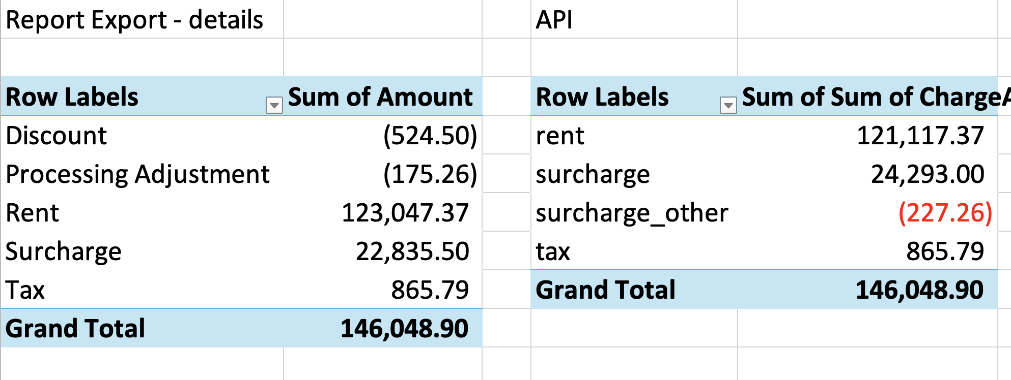 On the API it's showing surcharge or surcharge_other for both charges and discounts. You can tell the difference based on the sign -- surcharges will be positive, discounts negative. This is how things are stored under the covers in the data -- everything is a "surcharge", the fee vs discount is just based on sign.