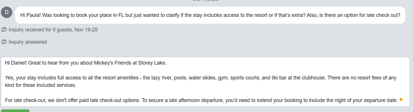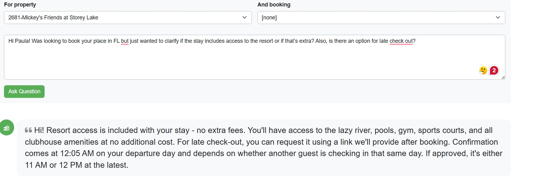 Here the guest asks for a late checkout, and the reply from Rezzy is partially correct