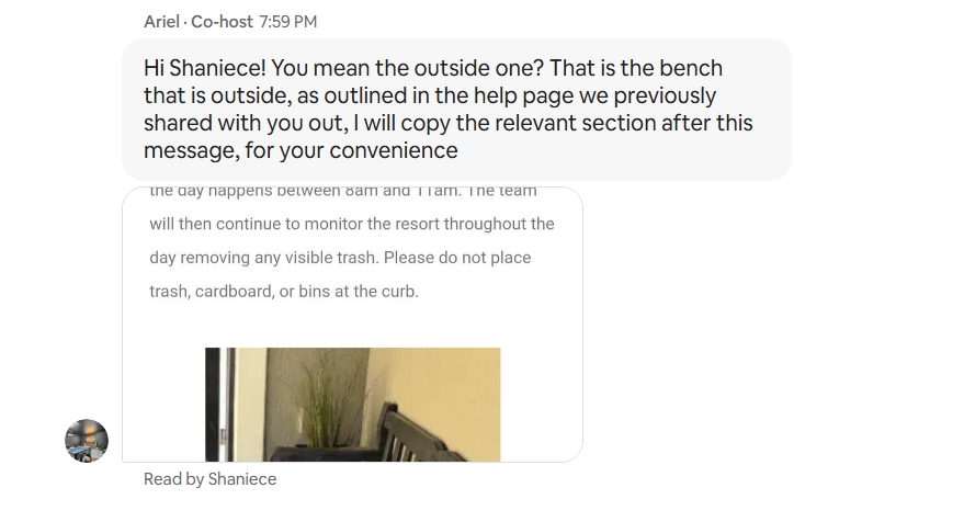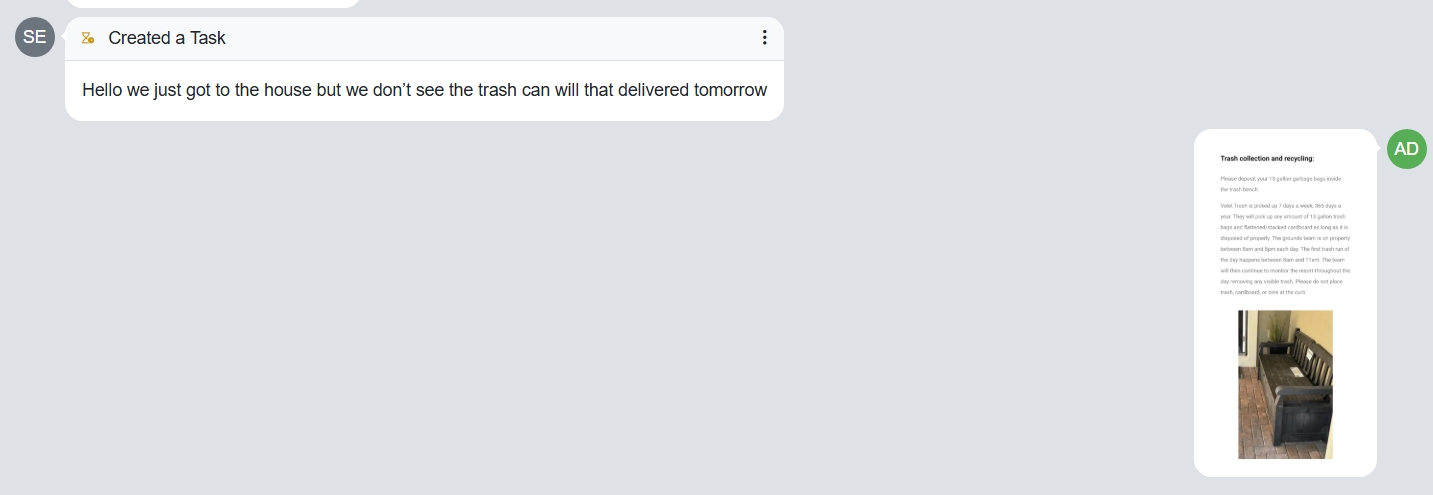 Some parts of a conversation are gone after replying...see this example, the guest asked where the trash bin is, I replied to the guest thru Rezzy, the reply was sent correctly to the guest (it shows on Airbnb), but is no longer to be seen in Rezzy (only the picture I sent after the text). This happened with both Airbnb and Vrbo conversations.