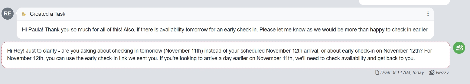 See this example, today, Nov 11th, a guest checking in tomorrow, is asking for an early check-in, and Rezzy implies today is Nov 10th (as it treats Nov 11th as "tomorrow"). You can see the messages from the guest and Rezzy were received today, Nov. 11th