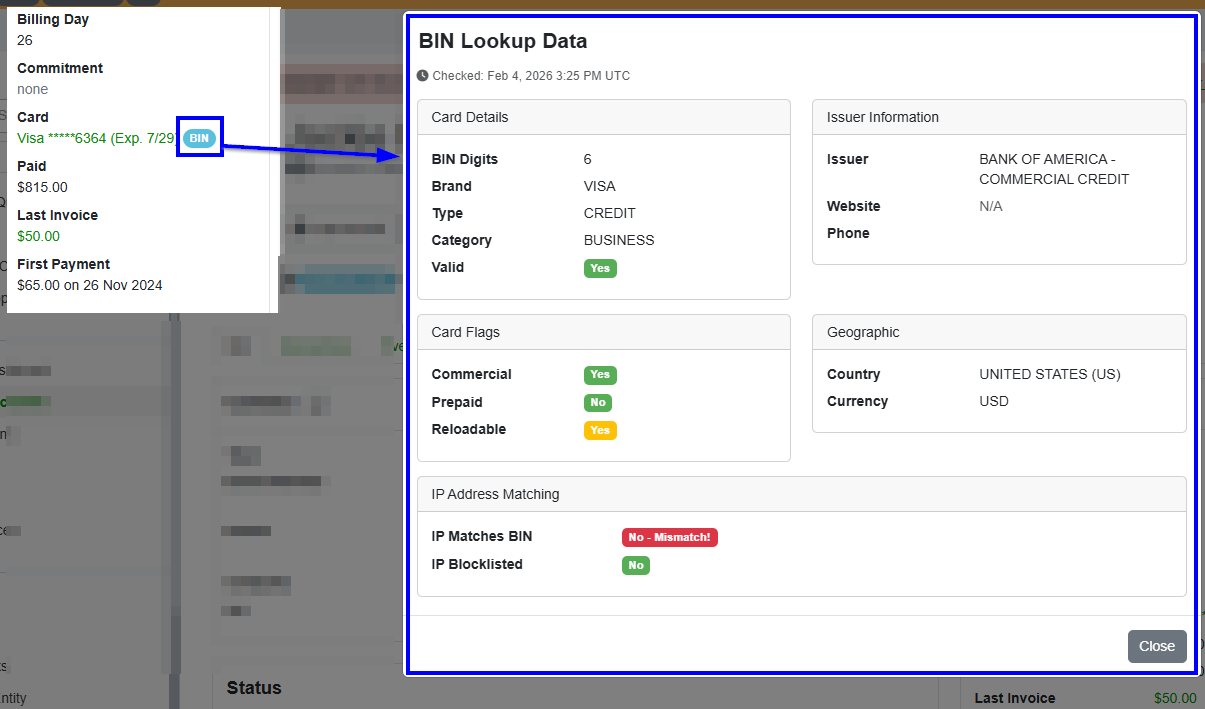 - From the SA (page or ticket sidebar) click the BIN button to see more details about the card and its issuing bank.