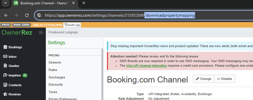 - Email to channels should include all associated listing IDs for that channel. This can be pulled using the URL https://app.ownerrez.com/settings/channels/##########/downloadpropertymapping changing ###### to the API channel ID (numeric from that channel URL)