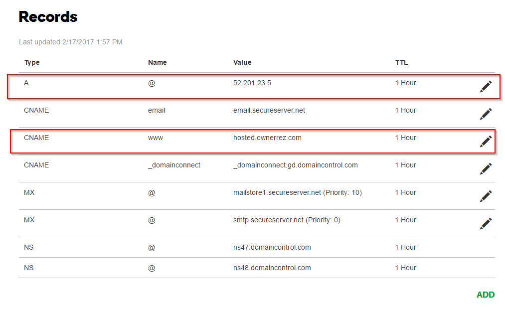 - If desired, create (or set if there is one already) a CNAME type record with a host name of "www.your-subdomain" pointing to hosted.ownerrez.com