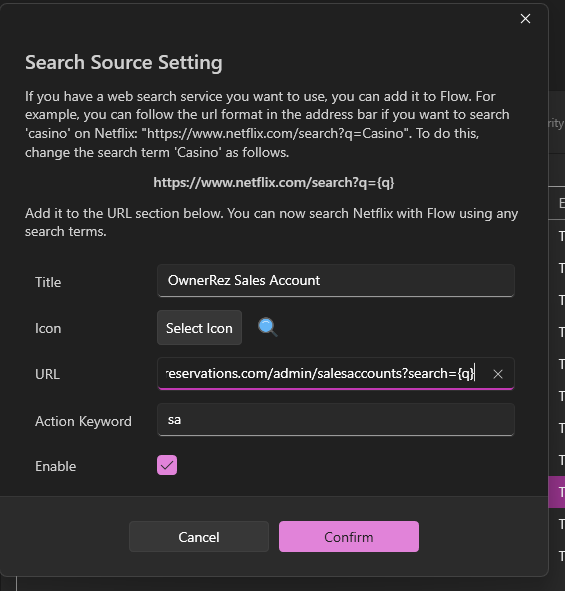 Flow Launcher has its own set of parameters (it doesn't tie into the Chrome ones), so you have to set up the keywords there as well...