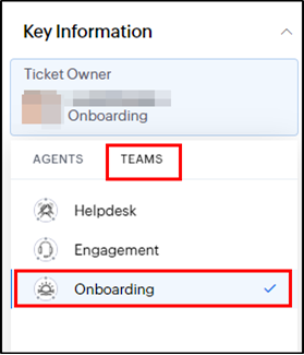 - Make sure in the left side bar, under Key Information, you assign the ticket to yourself. For ticket owner, choose Teams > Onboarding > select your name.