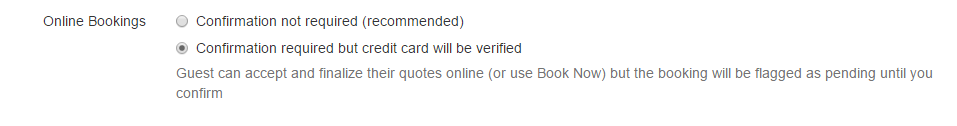 "Confirmation required but credit card verified" is a similar beast to the "check or custom payments pending" flow -- but for credit card payments instead. When you set this to "card will not be charged at checkout" (rather than "card will be charged at checkout"), we'll allow the guest to check out with a credit card, but we won't charge the card at checkout. Instead, we'll verify that the card is correct and create a pending booking in the system.