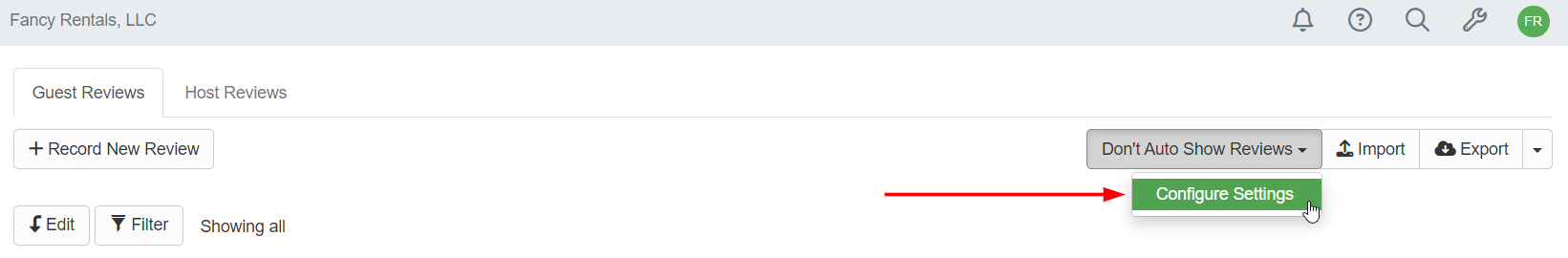 On the Reviews page, from the Configure Auto Show Reviews dropdown menu, select Configure Settings.
