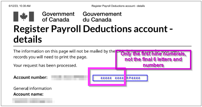 Submit Tax ID with only the first nine numerals of the Account or Business number, not the final 6 letters and numbers (for the first two forms, the third form only shows the 9 digit format).